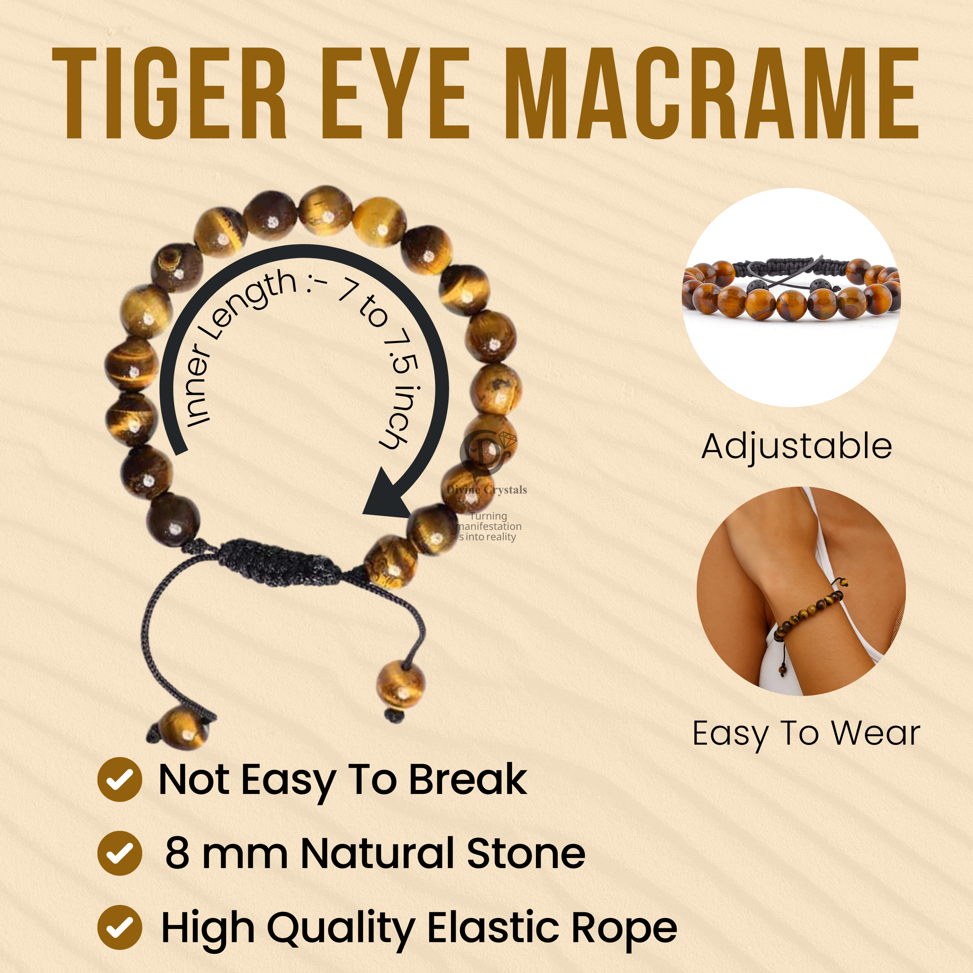 Crafted from 100% natural Tiger Eye with adjustable macrame thread, this bracelet is designed to support confidence, protection, and mental focus.